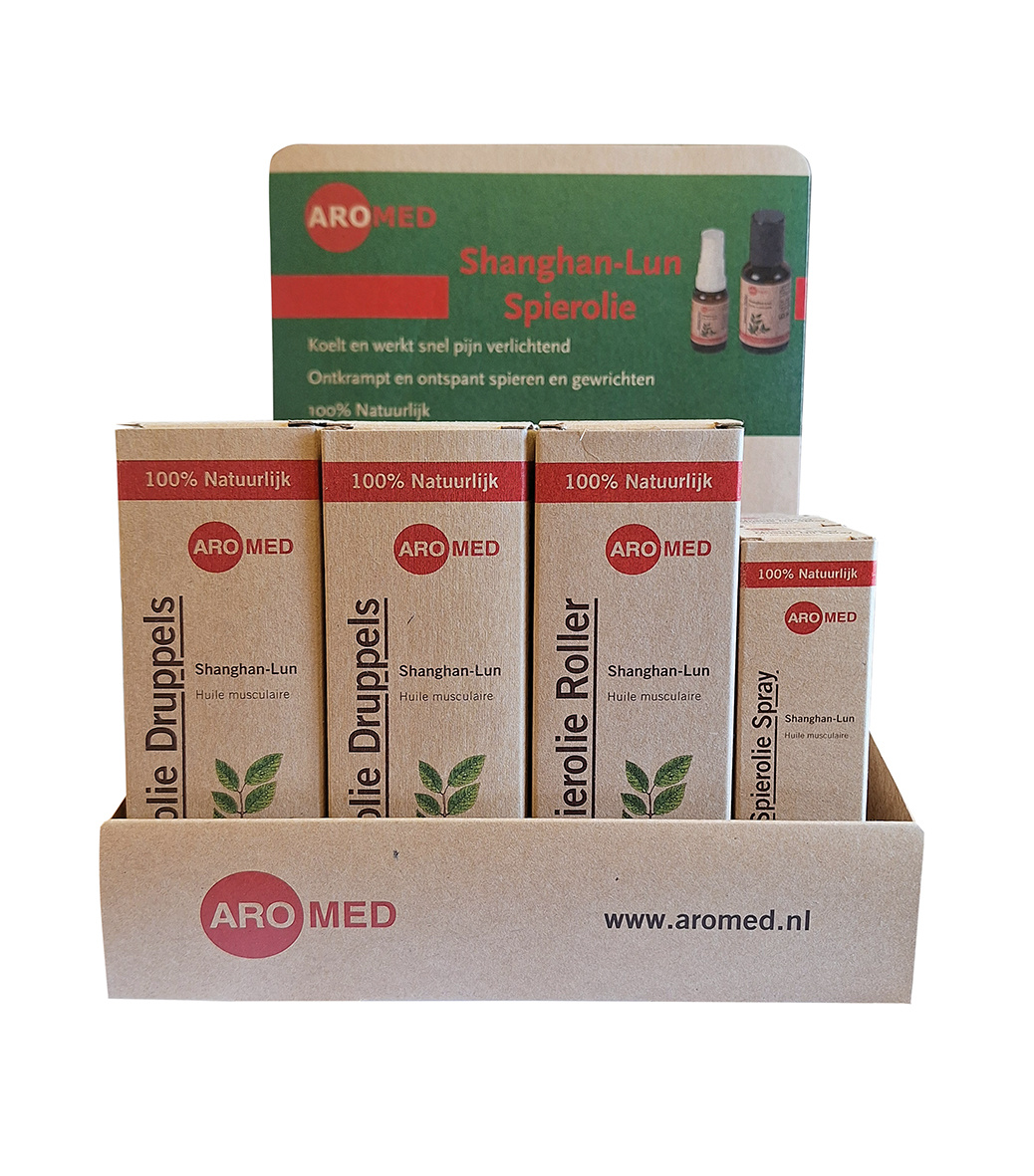 Inhoud Display: 6 x Shanghan-Lun Spierolie Druppels, 3 x Shanghan-Lun Spierolie Roller en 4 x Shanghan-Lun Spierolie Spray. NU met 20% korting!