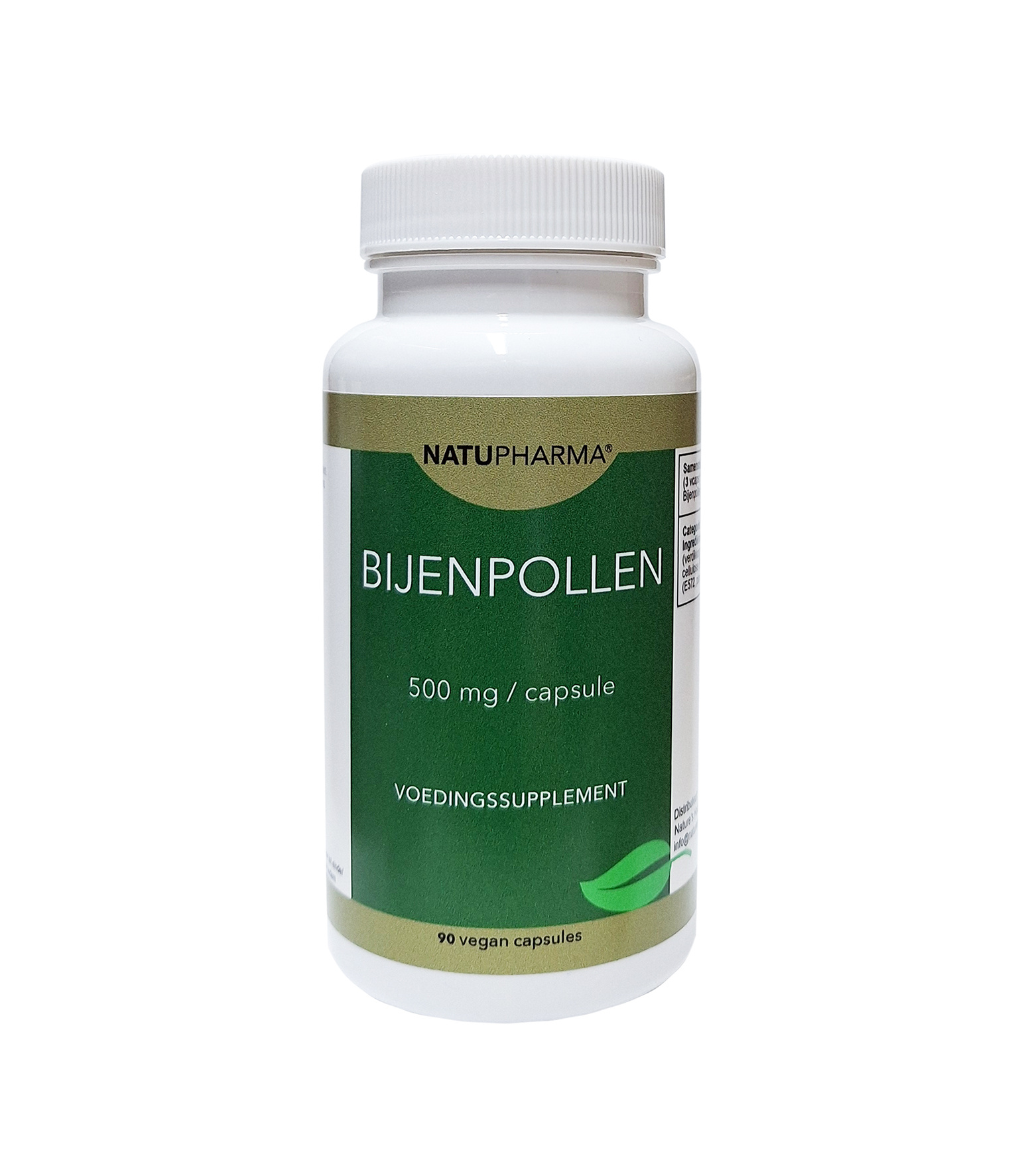 Ingrediënten: Bijenpollen, HPMC (verdikkingsmiddel/capsulehuls), microcrystalline cellulose (E460i, vulstof), magnesium stearaat (E572, plantaardig - antiklontermiddel).