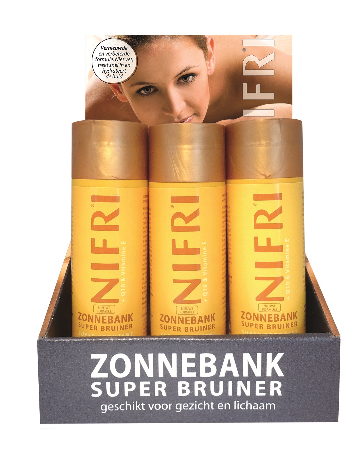 Nifri Zonnebank Super Bruiner bevat intensieve bruinversnellers die zorgen voor een zeer snelle en diepe bruining van de huid onder de zon(nebank). Daarnaast bevat het hydraterende bestanddelen voor extra verzorging van de huid. Door toevoeging van het actieve co-enzym Q10 en vitamine E wordt de huid optimaal beschermd tegen uitdroging, voortijdige huidveroudering en rimpelvorming. De huid blijft soepel elastisch en zacht.