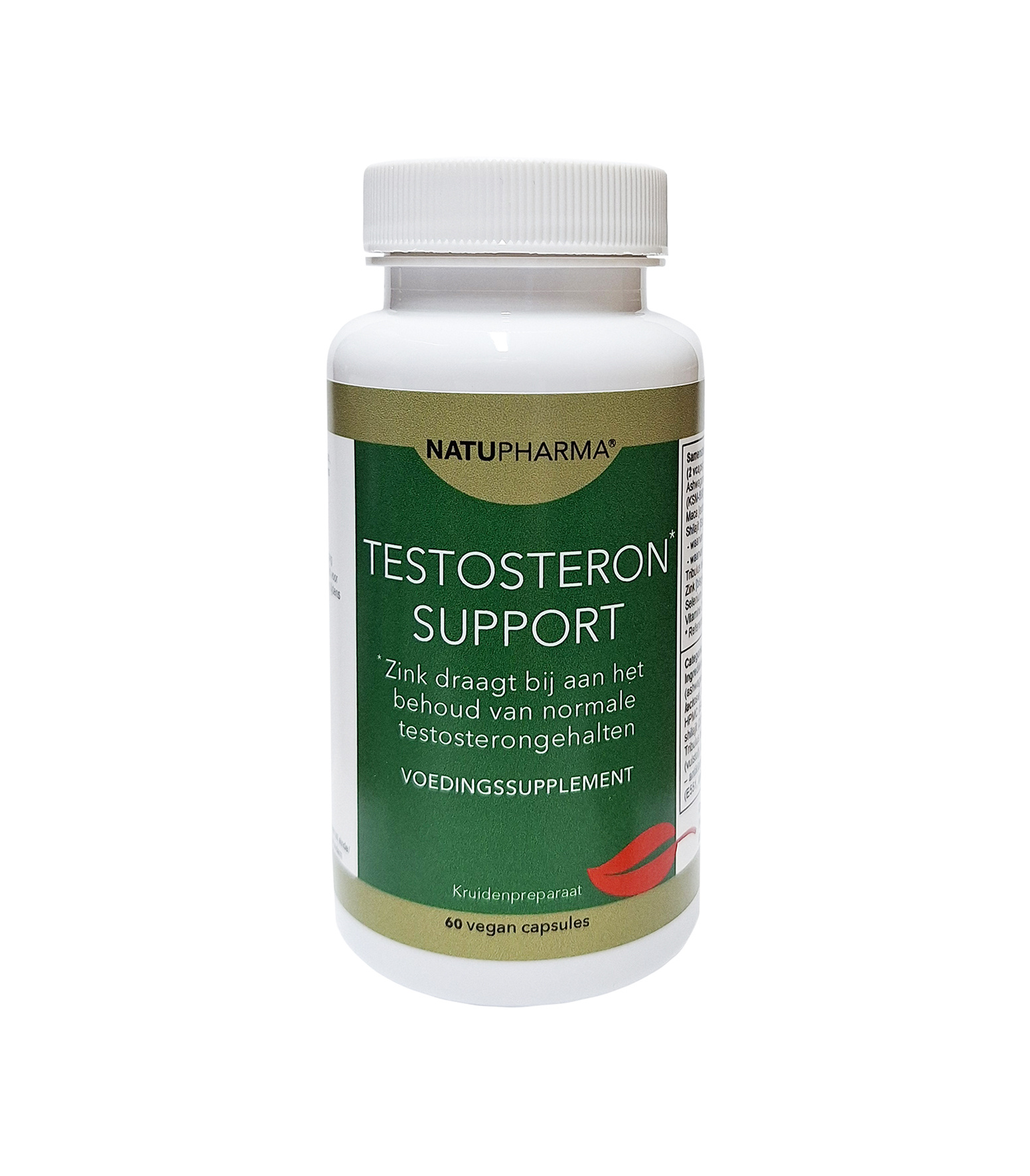 Ingrediënten: Withania somnifera (ashwagandha, KSM-66®)-extract (melk,lactose), maca (Lepidium meyenii) extract 4:1, HPMC (E464, verdikkingsmiddel – capsulehuls), shilajit (20% fulvinezuur / 60% humuszuur), Tribulus terrestris-extract, mineralen, rijstmeel (vulstof), magnesiumstearaat (E470b, plantaardig – antiklontermiddel), vitaminen, siliciumdioxide (E551, antiklontermiddel).